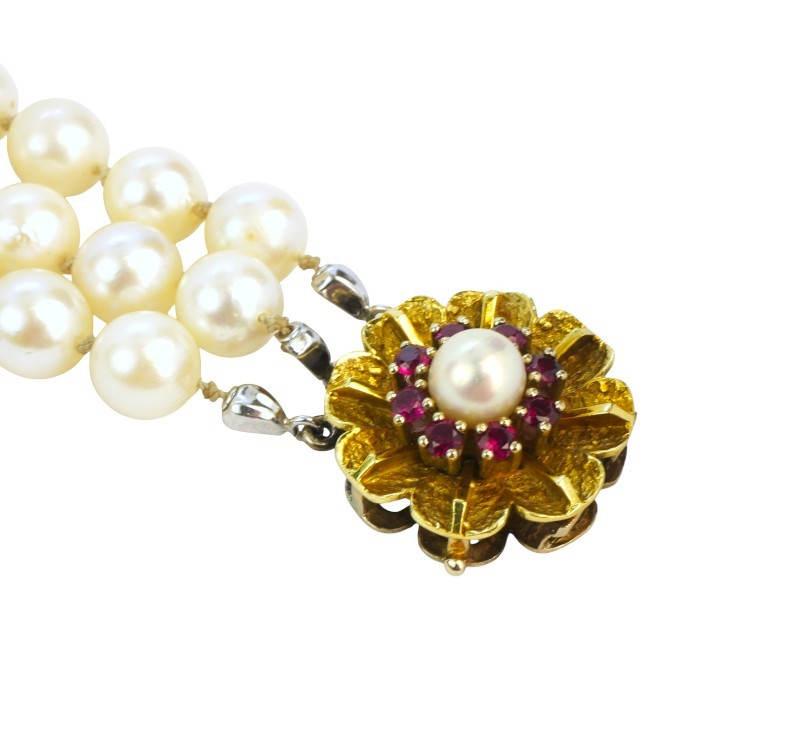 Náramek je tvořen třemi řadami pravých mořských perel (pravděpodobně typu Akoya), které mají vysoký lesk a bílou barvu. Dominantou šperku je masivní zlatá spona ve tvaru květiny. ze zlata ryzosti 585/1000 Střed spony je osazen centrální perlou, kterou obklopují drobné přírodní rubíny sytě červené barvy. Perly jsou navlečeny na hedvábné niti a fixovány uzlíky, což zabraňuje jejich vzájemnému odírání a zajišťuje bezpečnost při případném přetržení. Uzávěr je jištěn pojistkami. Délka náramku je 18 cm.