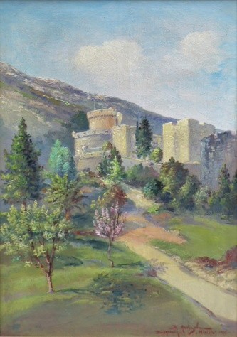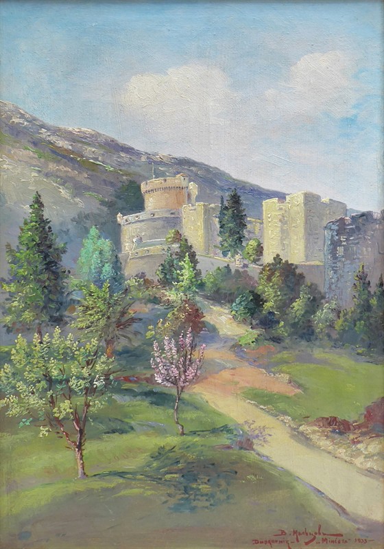 Olej na plátně 42 cm x 29 cm. Signováno vpravo dole s datací 1933 a názvem místa. Vzadu přípis tužkou s názvem obrazu a jménem malíře. Hradní pevnost Minceta (Minčeta) u města Dubrovník. V tmavě lakovaném dřevěném odstupňovaném rámu s tenkou zlacenou zdobnou vnitřní lištou. Dubrovník, rok 1933. Celkový rozměr s rámem 55,5 cm x 42,5 cm.