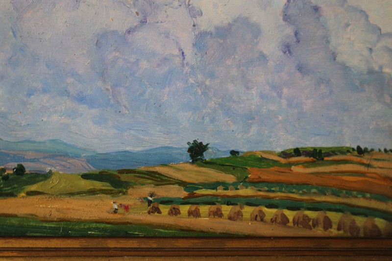 Václav Malý (1874 - 1935) Žně pod vysokým nebem Signováno viz foto. Český malíř a dokumentátor krojů, známý především svými díly inspirovanými Chodskem a Slováckem. Olej na kartonu.