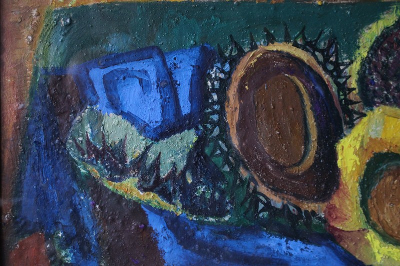 Václav Pavlík (19901 - 1966) Slunečnice s modrým klůchem Signováno viz foto. Scénograf, malíř a grafik. Olej na kartonu. Rozměry malba: 37 x 96 cm.