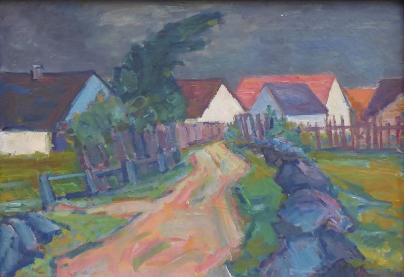 Olej na plátně 72 cm x 100 cm. Signováno vpravo dole s datací 1959. Autor: Václav Turek (1924-1988). Rozměrný obraz s pohledem na cestu vedoucí mezi chalupami s ploty a stromy ohraničujícími jednotlivé těsně sousedící pozemky. V odstupňovaném rámu světlejší barevnosti. Československo, rok 1959. Celkový rozměr s rámem 86 cm x 114 cm.