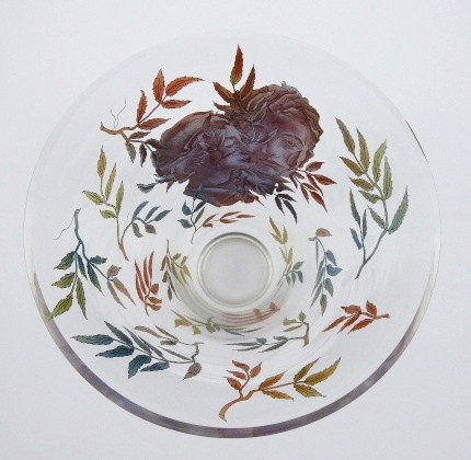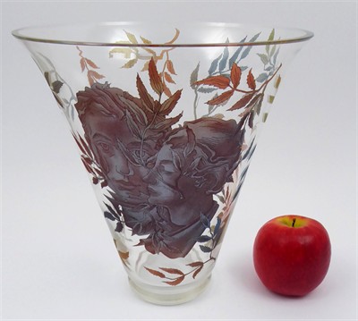 Bezbarvé sklo barevně leptané. Prostorově výrazná a velmi zajímavá váza tvaru obráceného zvonu z bezbarvého skla. Centrálním dekorem je barevně leptaný portrét mladé dvojice milenců. Zdobnost vázy podtrhují celoplošné lepty různě zbarveného podzimního listí. Československo, 30. až 50. léta minulého století. Výška 25,5 cm, průměr horního okraje 23,5 cm.
