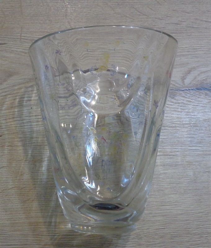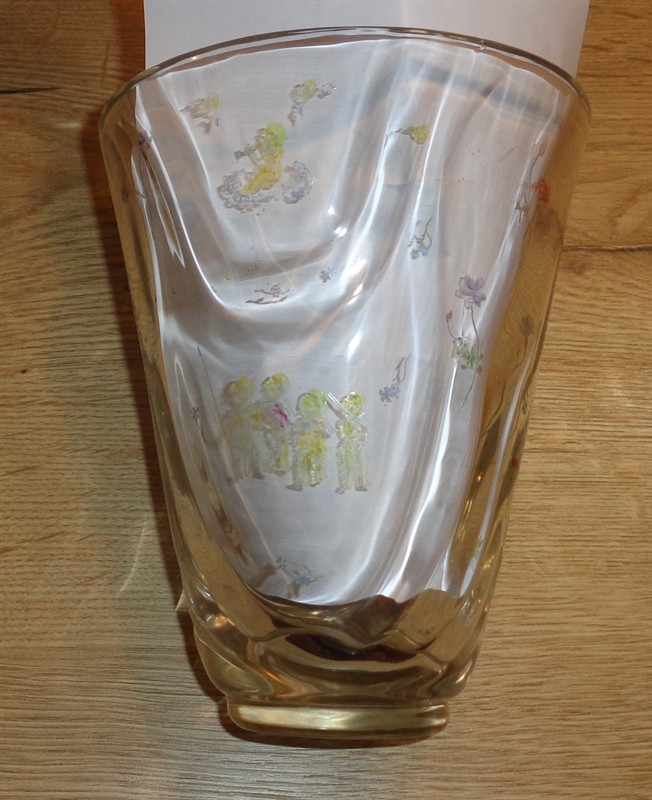 Krásná váza,která byla ročníkovou prací na sklářské škole v Železném Brodě v roce 1942 (značeno na dně)sklo broušené a leštěné,ryté motivy Sv.Václava a různě se poflakujících Blanických rytířů,andělíčků a květin,které jsou barvené,výška 17 cm,velmi zachovalá,stav viz foto,unikátní a jedinečná práce.