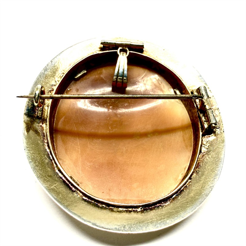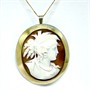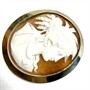 Nepřehlédnutelná brož s kamejí jež může být díky závěsnému očku užívána i jako závěs. Šperk byl zhotoven v pozdní viktoriánské éře ze zlaceného stříbra. Šperku dominuje kamej - portrét řecké bohyně vyřezaný z mušloviny velmi zdařile a detailně. Zasazeno do hladkého zlaceného rámečku vyrobeného ze stříbra ryzosti 835/1000. Celková váha 5,10 g. Jehla obecný kov. Rozměry 5,5 x 4,5 cm. Výborný stav.