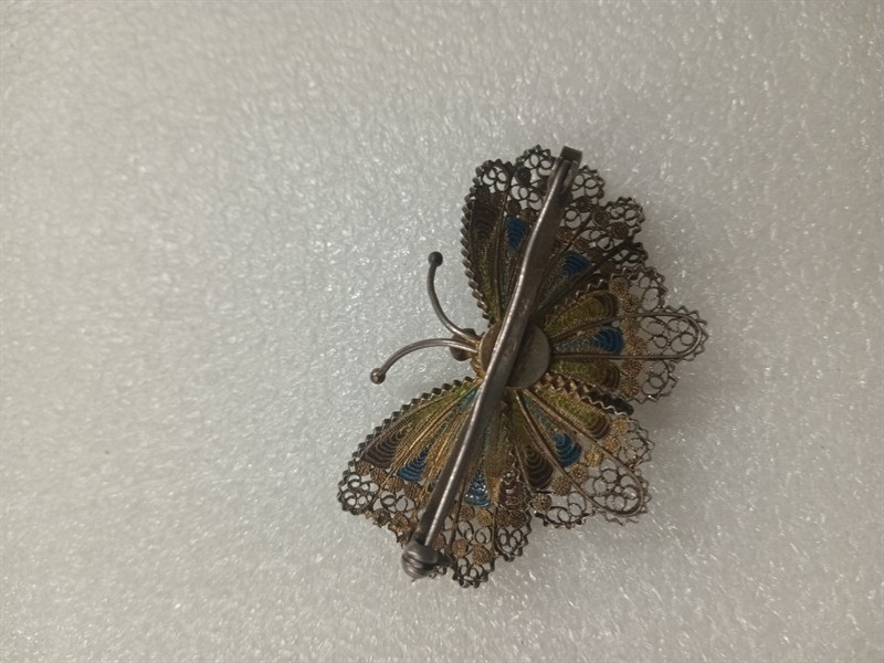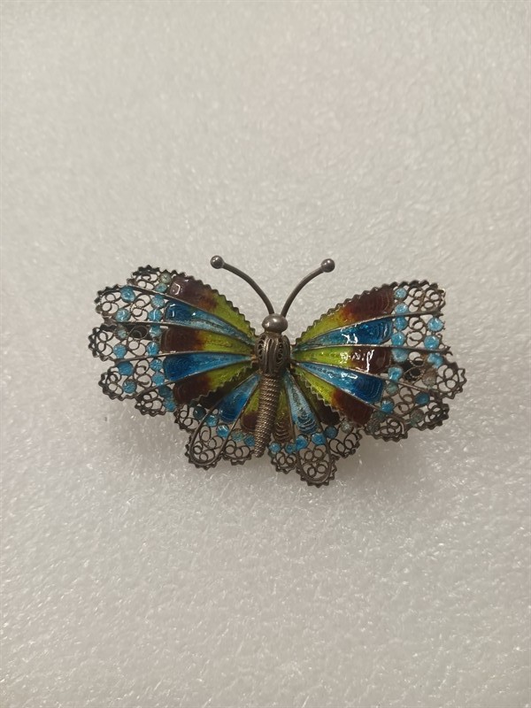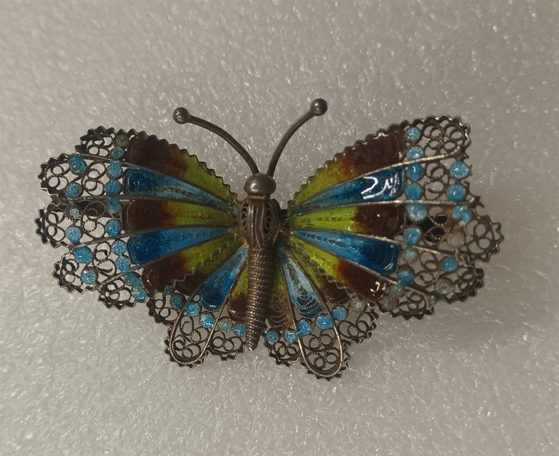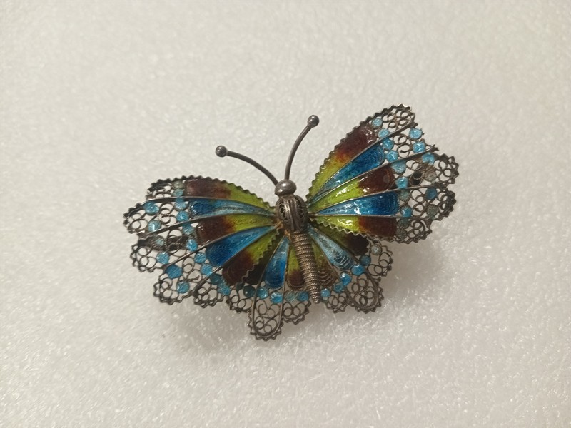 Velká krásná brož ve tvaru motýla, stříbro ryzosti 800/1000, filigrán se smalty . Délka 6 cm . Hmotnost 13,70 gr.