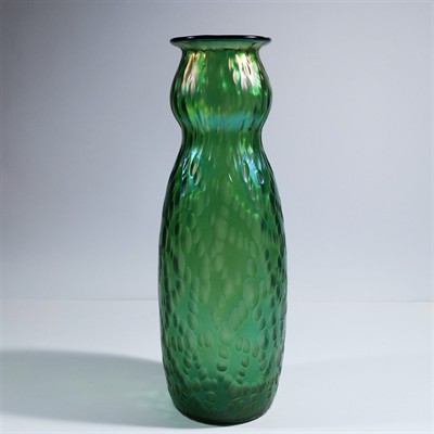kolem r. 1900, produkce sklárna Loetz, Klášterský Mlýn / Klostermühle, dekor Diana Ciselé Diaspora, neznačeno, výška 35 cm, hutně tvarované přejímané sklo, drobný ťuk na dolní hraně. Srov.: loetz.com/decors-a-z/diaspora/diaspora-diana-cisele.