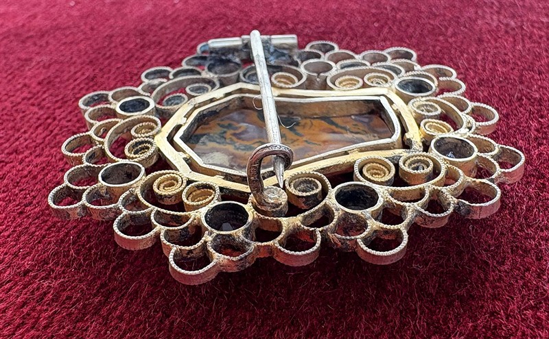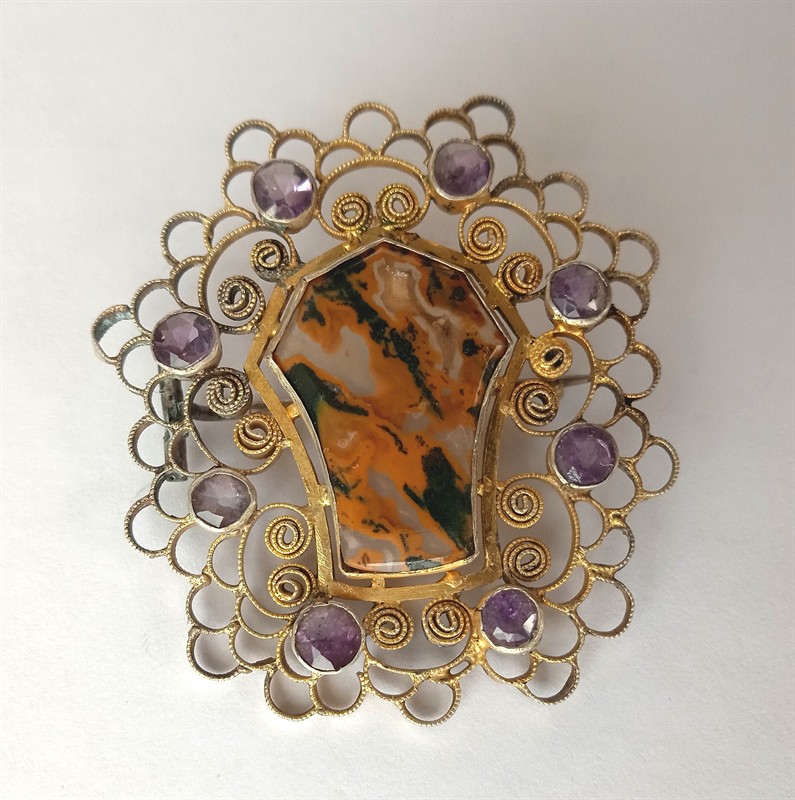 Velká stříbrná brož, částečně zlacená osazena centrálním průsvitným achátem a broušenými ametysty. Rozměry 5,1x5,1 cm, Celková váha brože 10,8 g