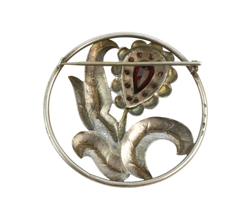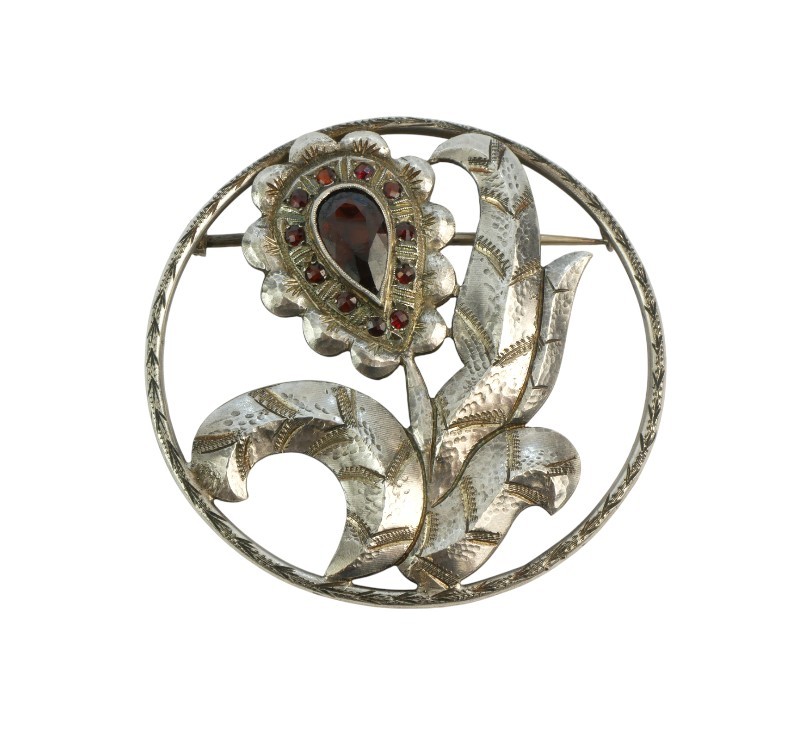 Originální tepaná brož se vsazeným velkým almandinem ve tvaru kapky a 11 granátky, art deco, 20. léta 20. století, stříbro 800/1000, mistrovská značka HP, průměr 5,6 cm, hmotnost 15,40 g, Turnov.