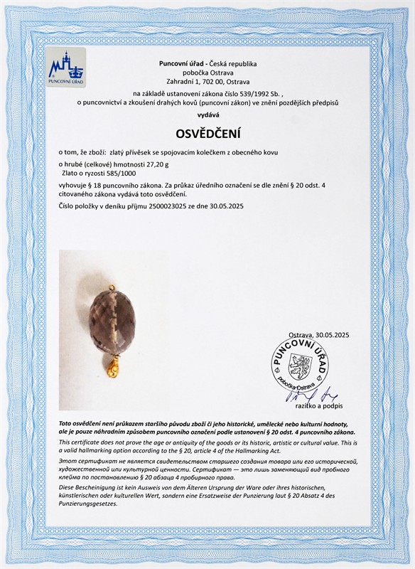 zlato o ryzosti 585/1000 celková váha 27,2 g celková výška 5,3 cm, šířka 2,2 cm barva - světle lila, broušený ametyst zlatý přívěsek se spojovacím kolečkem z obecné kovu zlatý přívěsek mírně potlučený ametyst výborný stav osvědčení puncovního úřadu