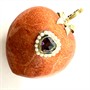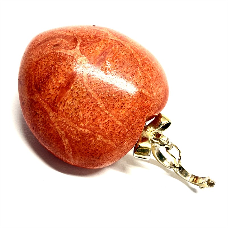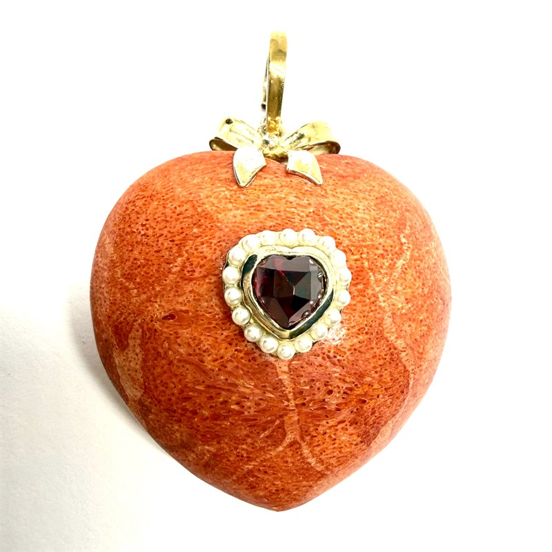 Výrazný závěs zhotovený z červeného mechového korálu. Střed šperku zdobí menší srdíčko z fazetově vybroušeného almandinu, jež rámují velmi drobné bílé perly. Díky většímu, otvíratelnému očku ze zlaceného stříbra může být šperk nošen mimo řetízku na perlovém či korálovém náhrdelníku, (korálová šňůra není součástí prodeje). Sterlingové stříbro (925/1000), celková váha 31,40 g. Rozměry 4 x 3,8 cm bez závěsného očka. Šperk je výborném stavu.