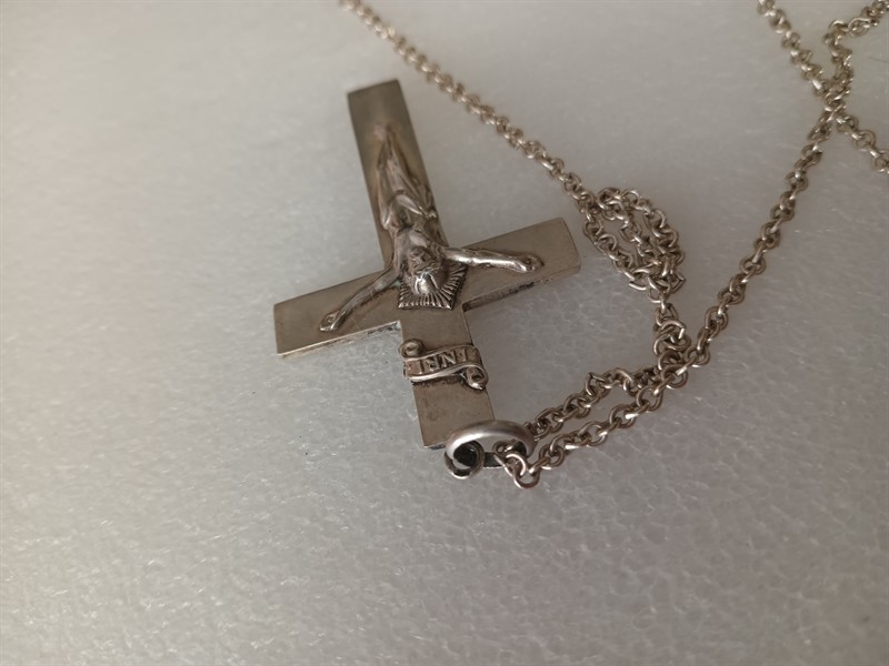 Starožitný pánský náhrdelník - kříž s Kristem . Stříbro ryzosti 800/1000 , rozměry kříže 7 x 4 cm . Délka řetízku 66 cm . Hmotnost 17,27 gr