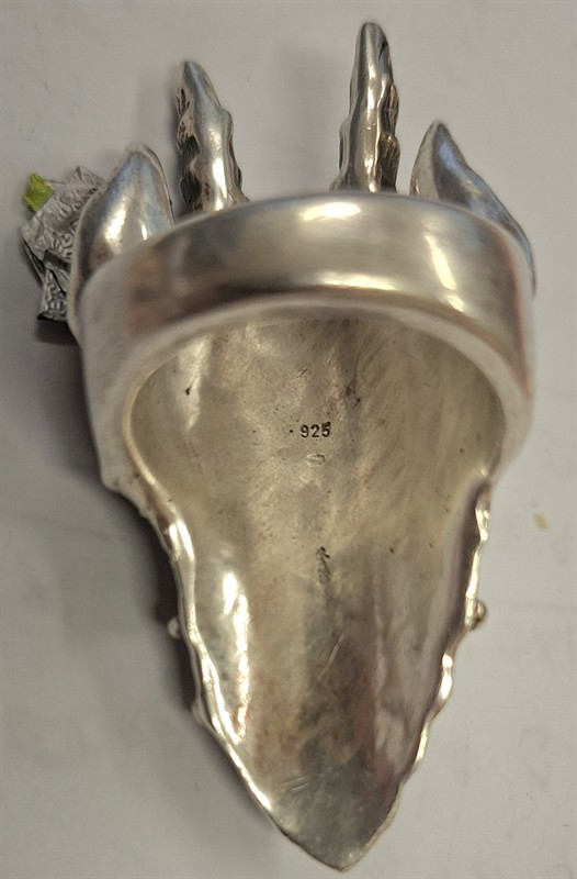 stříbro 925/1000, značeno číslicemi 925 a dodatečně puncováno platným českým puncem, hmotnost 55 g, celkový rozměr prstenu 6,5 x 3,5 x 3,5 cm, obroučka mírný ovál vnitřní rozměr 2,3 x 2,5 cm, značeno vzadu značkou Henry´s tj. Henry Desings Studio (USA), typický motorkářský prsten 90. léta m.s.