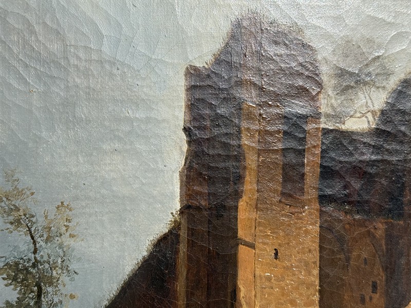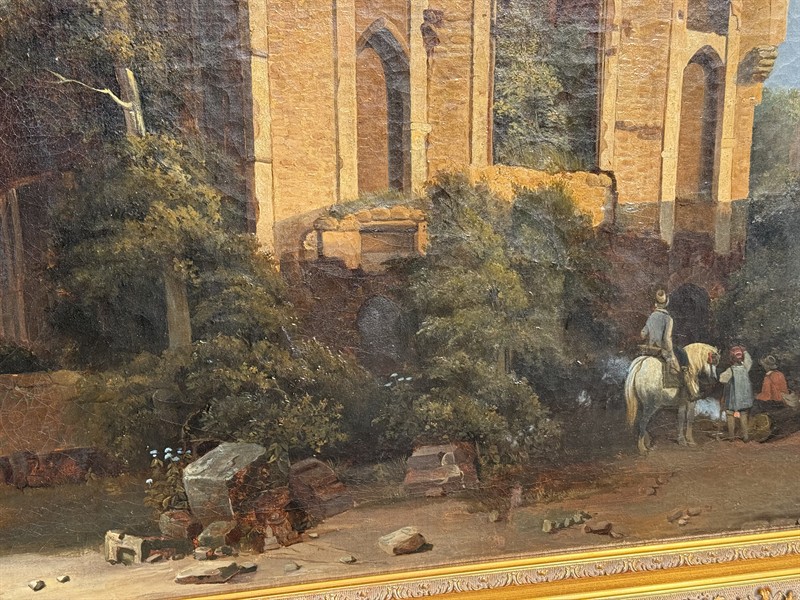 102 x 73 cm bez rámu, mistrovská muzeální kvalita, kolem roku 1800, cestující před rujinou, nesignováno, v dobrém původním stavu. Do historického i moderního interiéru! krásný kontrast světla a stínů.