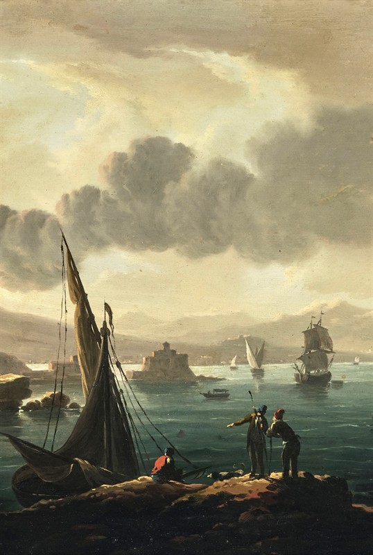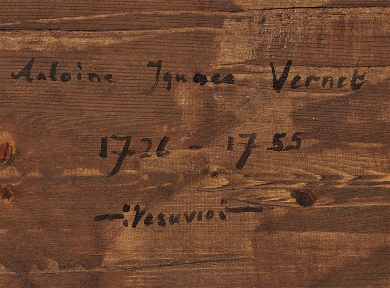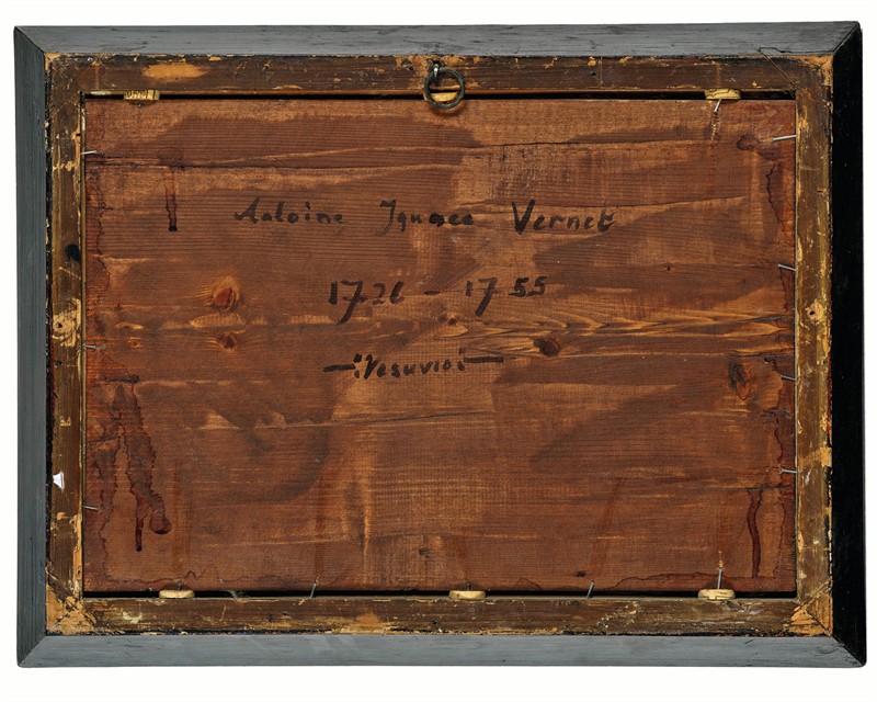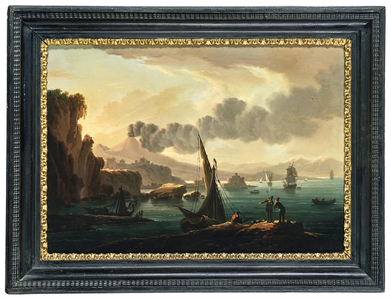 Vesuv a neapolský záliv za úsvitu”, olej na dřevěné desce, 30 x 43 cm rozměr bez rámu, 18.století, malíř z okruhu francouzského malíře Claude-Joseph Verneta. Pravděpodobně dle nápisu na zadní straně desky Antoine Vernet. Rám z 18.století 38 x 51 cm. Líbivý atraktivní námět.