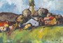 Letní krajinomalba s motivem venkovských stavení kolem kostelíčka pod modrobílou oblohou. Práce z roku 1978 od malíře, ilustrátora a pedagoga - Jiří LÍZLER (*1952 Jilemnice), působícího ve východních Čechách v okolí Jičína a Českého ráje. Olejomalba na desce v původním rámu, autorem sign. a dat. p.d. Dobý stav, celkový rozměr - 69 x 60cm, rozměr díla - 63 x 53cm