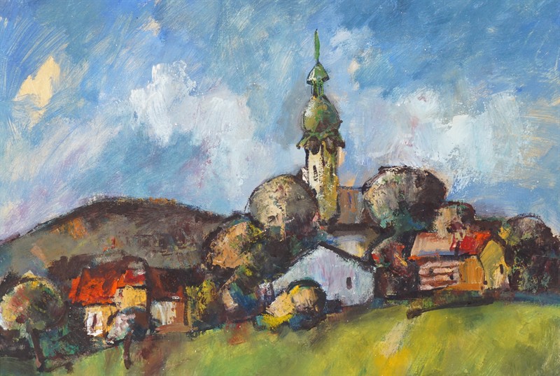 Víska s kostelíkem, olej na desce - Jiří LÍZLER 1978