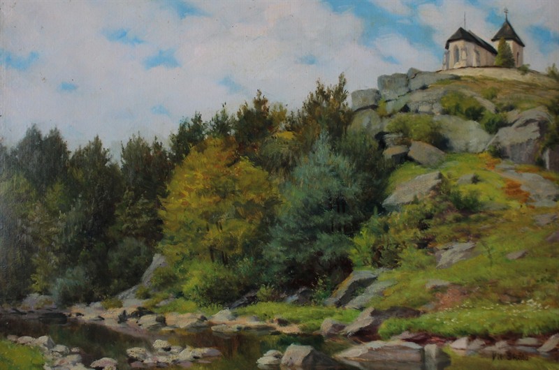 Vít Skála (1883 - 1967) - Kostel na kopci Signováno viz foto. Byl český malíř, scénograf a režisér. Olej na kartonu. Rozměry malba: 34 x 50 cm.