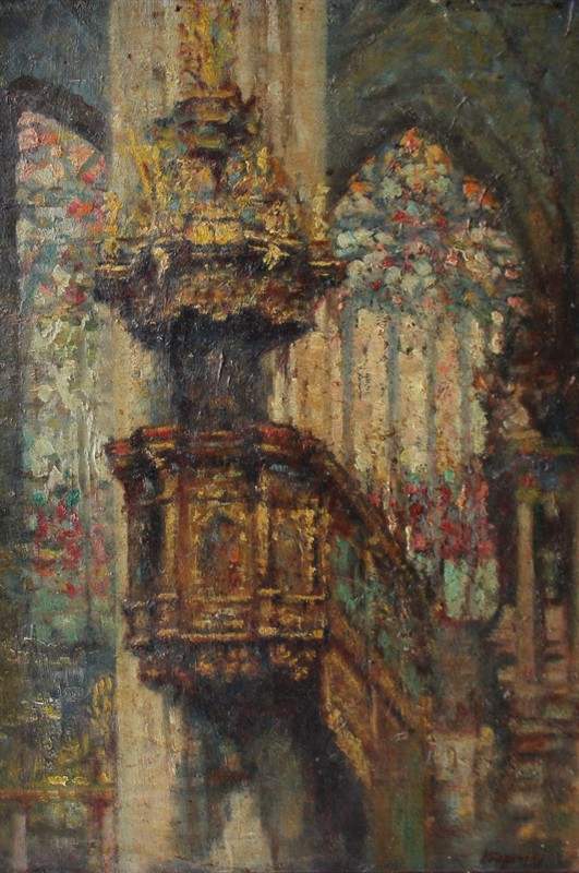 Vladimír Křepincký (1917 - 1985) - Interiér kostela  Signováno viz foto. Obraz je v původním nečištěném stavu. Olej na kartonu. Rozměry malba: 32 x 46 cm.