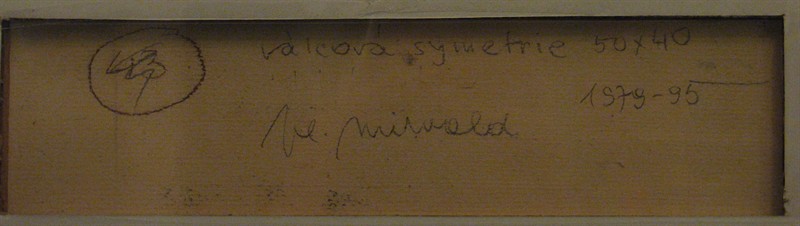 Válcová symetrie, 1979-95 (akryl na kartonu, 50 x 40 cm); na rubu sign., datace a popis autorem: Válcová symetrie, 50 x 40 cm, 1979-95, Vl. Mirvald. Provenience: z pozůstalosti autora, zakoupeno v Galerii Krbůšek. Adjustováno pod sklem - muzeální sklo. VLADISLAV MIRVALD (1921 - 2003) studoval v letech 1941 - 1945 na Vysoké škole architektury a pozemního stavitelství u profesorů Boudy, Lidického a Salcmana, obor výtvarná výchova, deskriptivní geometrie a modelování. Později studuje Pedagogickou fakultu Univerzity Karlovy v Praze. V letech 1954 - 1981 učí na lounském gymnáziu a Pedagogickém institutu v Ústí nad Labem. Malíř, kreslíř a experimentátor, člen významné skupiny Křižovatka. Vladislav Mirvald je jednou z klíčových osobností českého konstruktivního umění, byl osobitým malířem a vynálezcem nových výtvarných postupů a příslušníkem stále více ceněné generace 60. let.