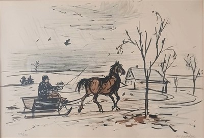 Velká barevná litografie. Stará pasparta, rám, sklo. Rozměr ve výřezu 34x47 cm, celkově 52x64 cm. Signováno, číslováno. Nepatrně poškozený rám. Typická práce známého umělce.