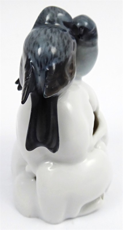 Bílý a ručně barevně malovaný porcelán. Autor návrhu modelu: Wunderlich. Název modelu: Spatzenpaar. Design modelu: rok 1914. Dvojice společně si cvrlikajících vrabčáků sedících na kupolovitém podstavci stylizovaném do podoby hnízda. Značeno zespodu: značka Rosenthal platná pro dané období, vtlačená čísla a značka malíře. Německo, Rosenthal, kolem roku 1923. Výška 7,5 cm, rozměr podstavce 5,5 cm x 4 cm.