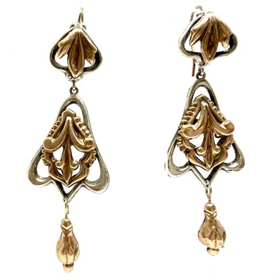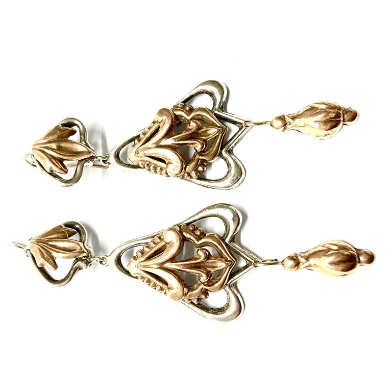 Efektní, dlouhé, závěsné náušnice zhotovené v secesním stylu v první polovině 20.století. Náušnice v kombinaci sterlingového stříbra (925/1000) a zlata ryzosti 333/1000. Celková váha 5,10 g. Osvědčení Puncovního úřadu. Délka cca 8 cm. Náušnice jsou lehké a velmi příjemně nositelné, výborný stav.