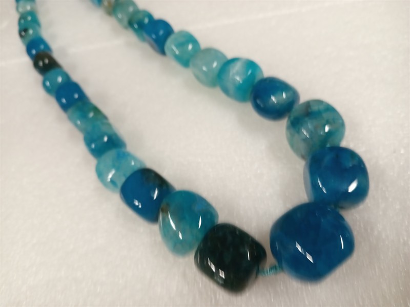 Výrazný náhrdelník s modrými chalcedony,kdy největší mají rozměry 2,5 x 2 cm. Kameny jsou pečlivě uzlíkovány . Délka náhrdelníku je 70 cm.