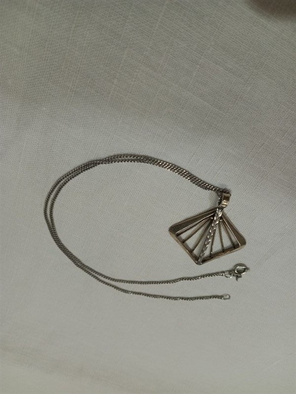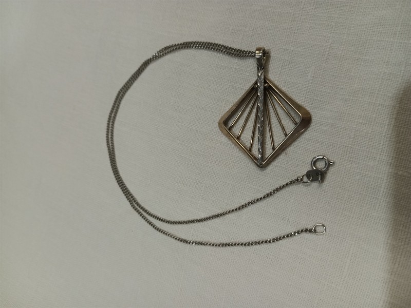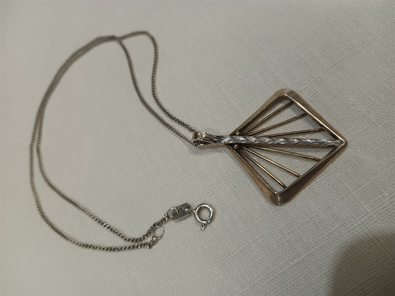 Výrazný retro náhrdelník vyrobený ze stříbra ryzosti 900/1000 , řetízek ryzosti 925/1000. Přívěsek je je po vnější hraně zlacený . Rozměry přívěsku jsou 4,2 x 3,3 cm . Délka řetízku je 42 cm . Celková hmotnost 6,36 gr.
