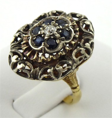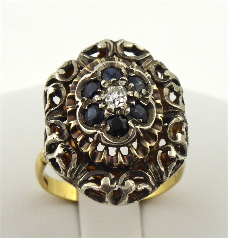 Osmnáctikarátové žluté zlato, stříbro, přírodní diamant o váze 0,15 ct, šest přírodních safírů. Období a styl: historismus. Ryzost Au 750/1000, celková hmotnost 7,0 g. Krásný zlatý prsten z období historismu s výraznou hlavou ze stříbra s prořezávaným ornamentem. Ve florálním lůžku hlavy prstenu je centrálně zasazen větší přírodní diamant starého briliantového brusu o váze 0,15 ct, barva G, čistota SI, jehož doplňuje ve formě květu šest přírodních ručně broušených modrých safírů. Originální luxusní ozdoba ruky. Značeno: československý punc kohout a zajíc, mistrovská značka. Evropa 1880 - 1910. Velikost prstenu 55-56, rozměr hlavy prstenu 25 mm x 20 mm.