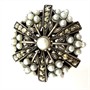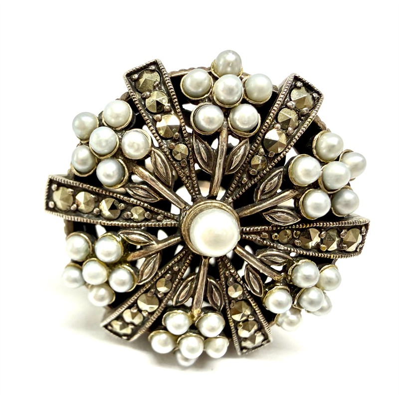 Nevšední, nepřehlédnutelný stříbrný prsten. Šperk zdobí drobné, sněhobílé perly kontrastně dozdobené elegantně se třpytícími markazity. Prsten nese neobvykle ztvárněný florální motiv. Stříbro sterlingové ryzosti 925/1000, váha 10,66 g. Velikost 56. Průměr dekorativní hlavice 2,5 cm. Šperk je v perfektním stavu.