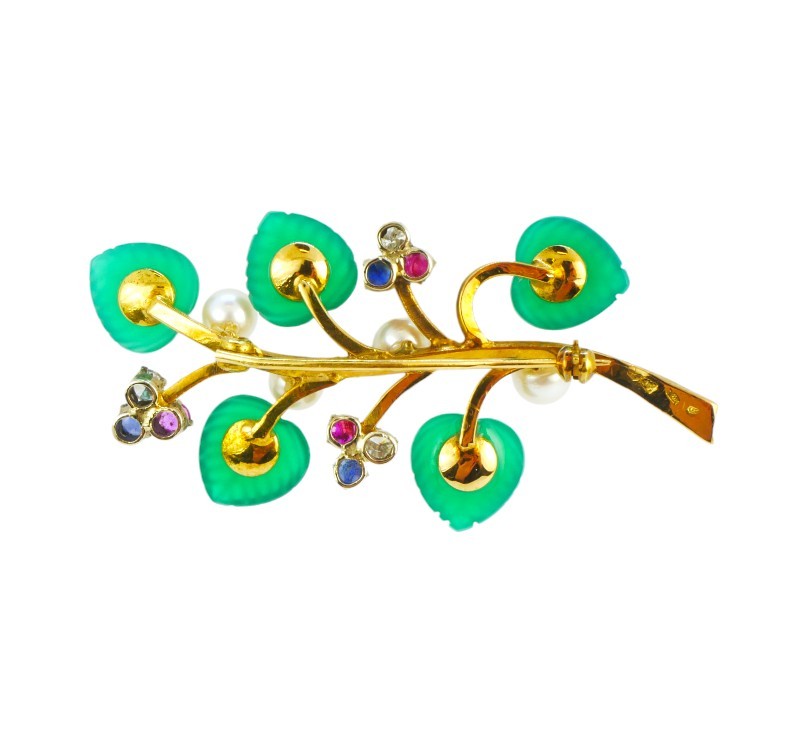 Půvabná brož zdobená drahými kameny a perlami. Šperk byl zhotoven ze 14ti karátového zlata (585/1000), o celkové hmotnosti 12,23 g. Zdobí jej ručně vyřezávané acháty, perly rubíny, safíry a brilianty. Rozměry cca 6 x 3,2 cm. Perfektní stav.