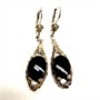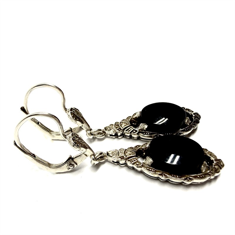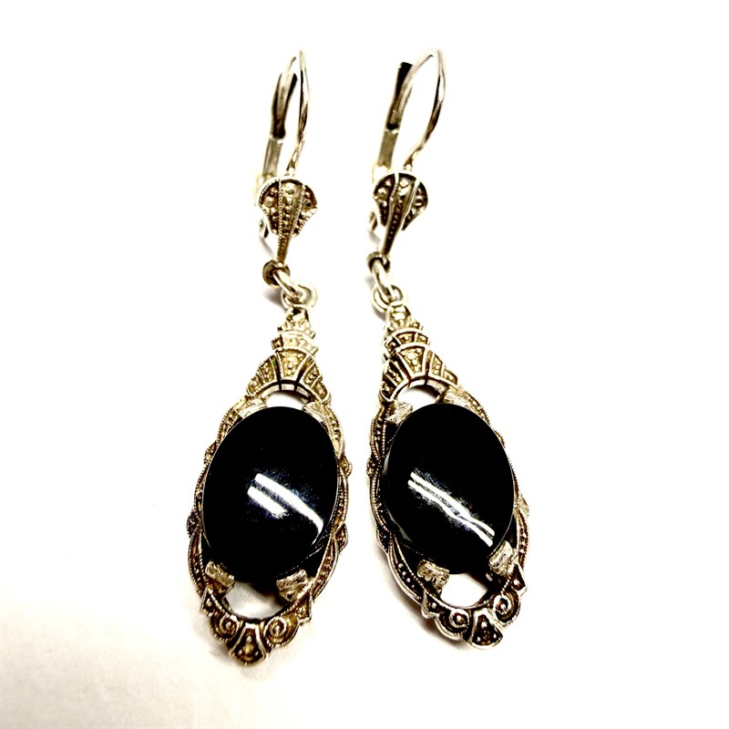 Velmi půvabné, elegantní, závěsné, stříbrné náušnice zhotovené ve stylu Art deco. Náušnice zdobí černý onyx oválného tvaru zasazený v jemné detailně zdobené obrubě. Stříbro ryzosti 935/1000. Celková váha 4,04 g. Délka 4 cm. Perfektní stav.