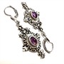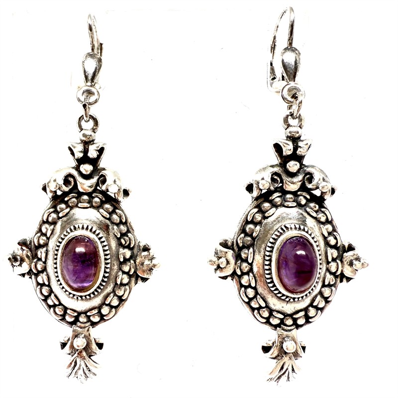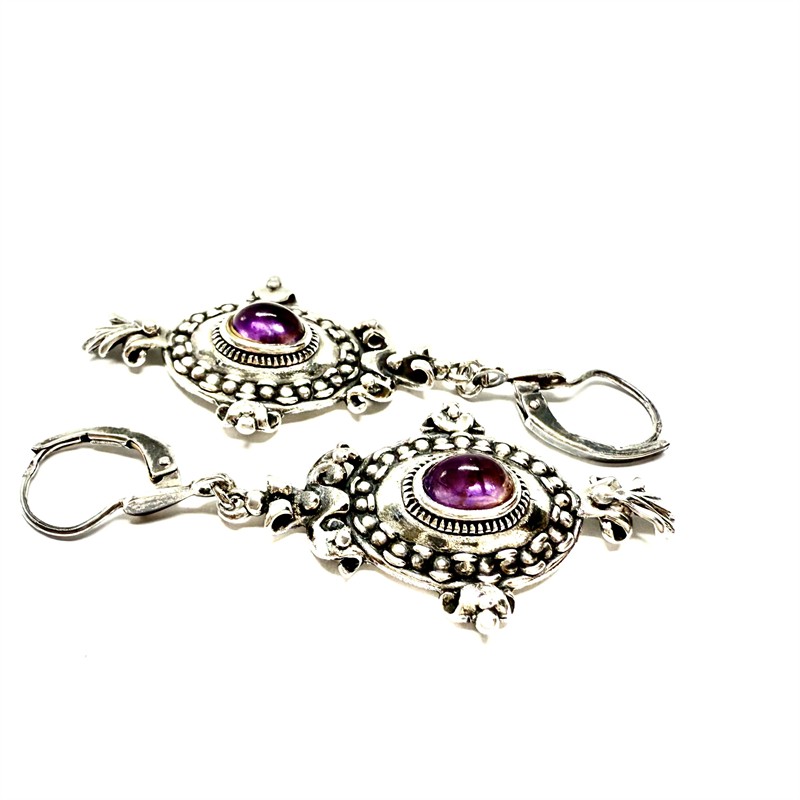 Delší, velmi dekorativní náušnice. Vyrobeny ze sterlingového stříbra (925/1000). Celková váha 6,83 g. Střed náušnic zdobí ametyst hladkého brusu kabošon. Délka 3,4 cm. Náušnice byly profesionálně vyčištěny zlatníkem a jsou v perfektním stavu.