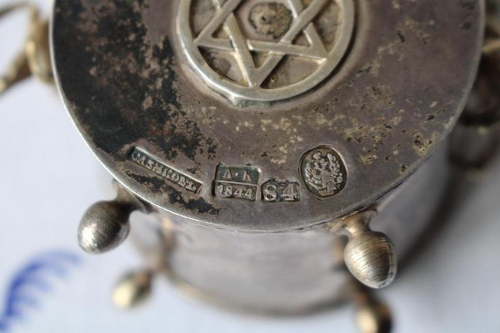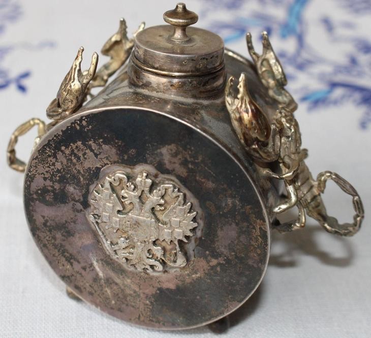 Židovsko rusky stříbrný kalamář - puncováno Židovsko rusky Starožitný stříbrný kalamář - puncováno Starožitný kalamář vyrobený v roce 1844. Tělo bubnového tvaru, podepřené čtyřmi patkami. Přední strana s dvouhlavým orlem, zadní s Davidovou hvězdou. Po stranách bubnu dva plíživý štíři útočící na přihrádku s víkem. Krásný kousek. Puncováno v roce 1884. Váha 152,1 g. Petrohrad 1857, mistr punců TT, tvůrce Pavel Sazikov,Puvodni cena je:1000 Liber