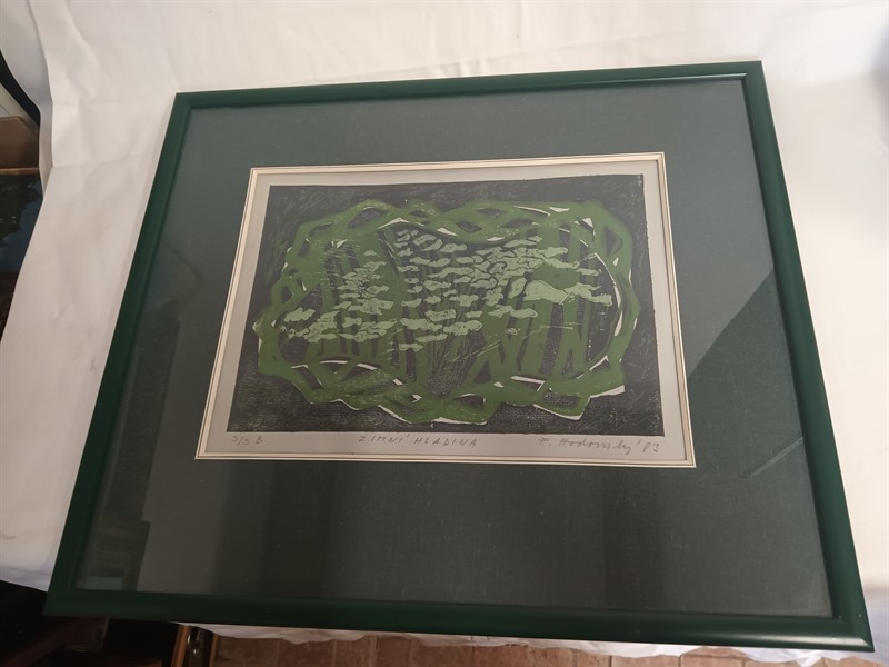 Kombinovaná technika pod sklem - Zimní hladina , Fr. Hodonský 83 . Celkový rozměr 48 x 42 cm .