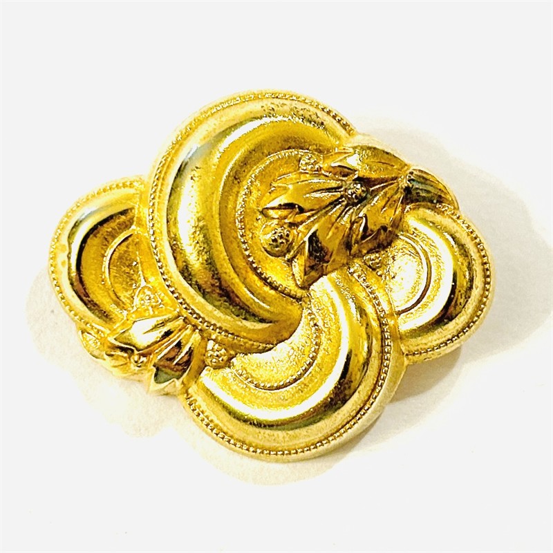 Starožitná brož z období biedermeieru v podobě stylizovaného uzlu s propleteným listovým s malými piniovými šiškami. Kvalitní středoevropská zlatnická práce z poloviny 19. století. Vyrobeno technikou dutého kovu. Zhotoveno ze silně zlaceného obecného kovu; neznačeno. Hmotnost 4,42 g, délka 37 mm, šířka 31 mm. Zapínání na "C" sponu v pořádku, lehké stopy nošení, jinak v dobrém stavu, odborně vyčištěno a vyleštěno zlatníkem.