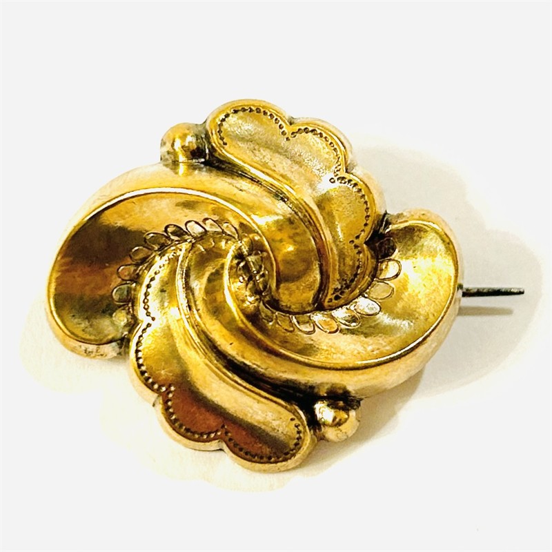 Starožitná brož z období biedermeieru v podobě stylizovaného uzlu, jednotlivé plastické části inspirované florální estetikou, zdobeno rytím. Kvalitní středoevropská zlatnická práce z poloviny 19. století. Vyrobeno technikou dutého kovu. Zhotoveno ze silně zlaceného obecného kovu; neznačeno. Hmotnost 5,69 g, délka 33 mm, šířka 28 mm. Zapínání na "C" sponu v pořádku, nepůvodní jehla, stopy nošení, jinak v dobrém stavu, odborně vyčištěno a vyleštěno zlatníkem.