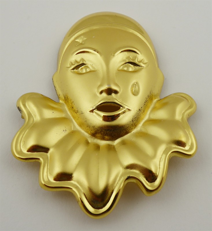Zlacené stříbro vysoké ryzosti. Ryzost Ag 925/1000, celková hmotnost 8,50 g. Zlacená stříbrná reliéfně tvarovaná brož do podoby melancholického milovníka Pierota - původní postavy francouzského lidového divadla a pantominy, kde spolu s Kolombínou a Harlekýnem působil v commedii del´arte. Značeno: ryzost 925 a mistrovská značka. Itálie, Vicenza, konec minulého století. Výška brože 60 mm, šířka brože 45 mm.