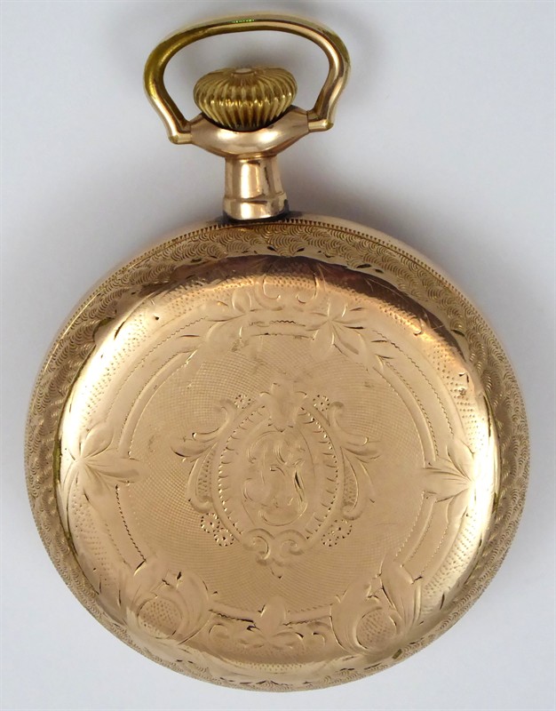 Silně zlacený žlutý kov. Celková hmotnost 85,65 g. Kapesní dvouplášťové hodinky se závitem na zadním plášti. Bílý emailový ciferník s černými a červenými ručně malovanými arabskými číslicemi a vteřinovkou. Modřené ocelové ručičky. Ciferník značený: HAMPDEN WATCH Co. Výrobce: HAMPDEN WATCH Co., Canton, Ohio, USA založený roku 1877. Gravírovaný zadní plášť s nápisy: WARRANTED 20 YEARS, číslovaný 953 6796. Hodinový stroj značený: No 108, SAFETY PINION 17 JEWELS CANTON O a číslovaný 3171399. Funkční. Vzhledem ke stáří hodinek bez záruky přesnosti chodu a dlouhodobé funkčnosti. USA, Ohio, Canton 1916 - 1917. Průměr 50 mm.