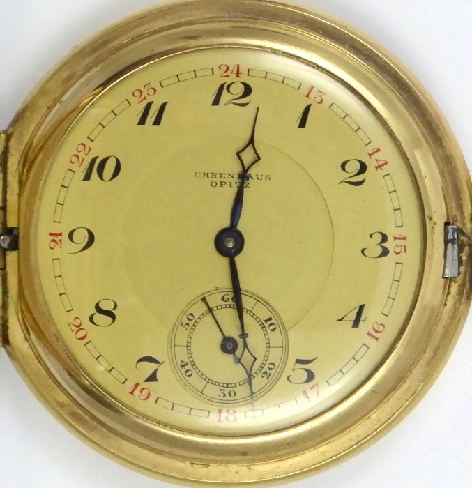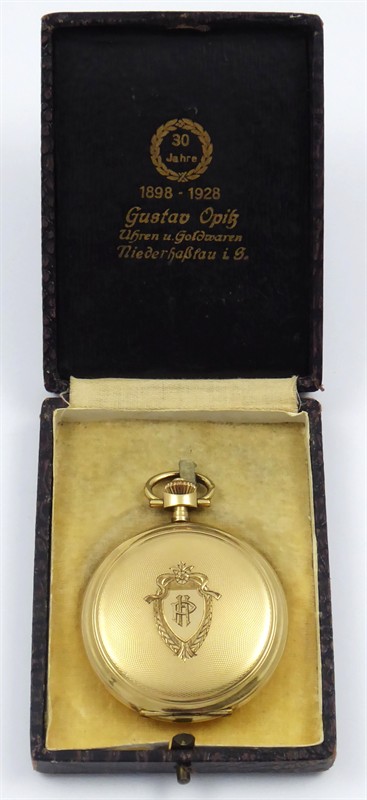 Silně zlacený žlutý kov a doublé. Celková hmotnost hodinek 94,85 g. Celková hmotnost řetízku k hodinkám 11,35 g. Kapesní tříplášťové hodinky s ciferníkem barvy champagne se jménem prodejce: UHRENHAUS OPITZ a s černými a červenými arabskými číslicemi a vteřinovkou. Modřené ocelové hodinové ručičky. Prodejce: Gustav Opitz, Niederhasslau. Hodinky od firmy Steinmeyer´s, Pforzheim, Německo. Řetízek k hodinkám doublé (zlacený) od firmy Andreas Daub, Pforzheim, Německo. Gravírované a gilošované pláště. V originální krabičce značené: Gustav Opitz, Uhren u. Goldwaren Nierderhasslau i. S. s vavřínovým věncem 30 Jahre 1898 - 1928. Značené: GRARANTIE 10 JAHRE, číslo 12927, STEINMEYER´S ORIGINAL a značkou výrobce řetízku. Funkční. Německo, Niederhasslau, Pforzheim, rok 1928. Průměr: 60 mm.