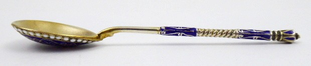 Stříbro, zlacení, email. Ve stylu carského Ruska. Ryzost Ag 800/1000, celková hmotnost 76,40 g. Přiloženo osvědčení Puncovního úřadu České republiky. Pět lžiček ve stylu carského Ruska dekorované technikou vermeil, cloisonné s motivem arabesky. Ručně malované modrými, bílými a zlacenými emailovými barvami. Evropa, minulé století. Délka 11 cm.