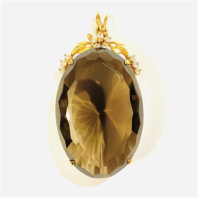 Výrazný, extravagantní závěs osazený velkou přírodní tmavší záhnědou oválného brusu (délka 45 mm), zasazeno v rámečku s florálně dekorativním frontonem osazeným čirými kameny kulatého brusu. Kvalitní zlatnická, patrně asijská práce z poslední čtvrtiny 20. století. Zasazeno ze zlaceného obecného kovu; neznačeno. Hmotnost 31,43 g, celková délka 61 mm, šířka 31 mm. V zachovalém stavu. Přírodní původ kamene ověřen u gemologa.