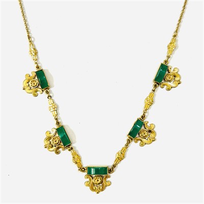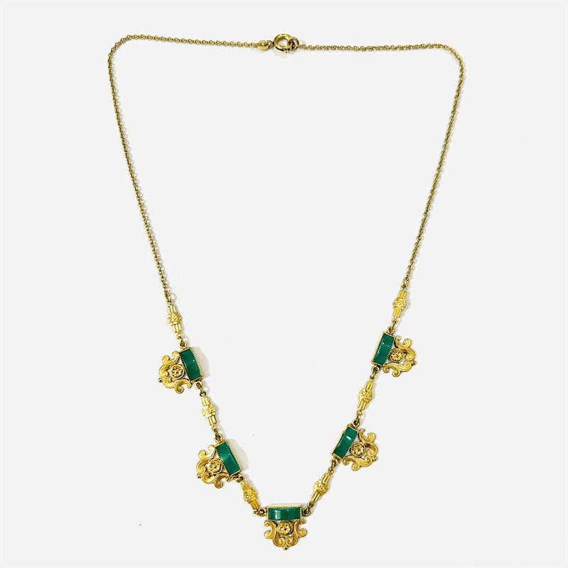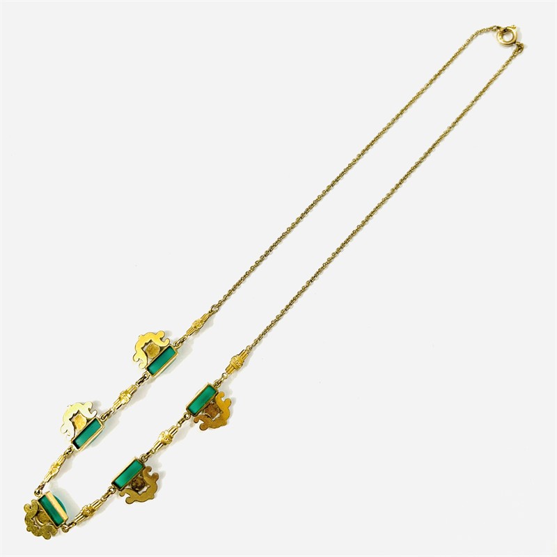 Půvabný náhrdelník s dekorativními, pseudobarokně laděnými články, v zrnitých obrubách osazeno 5 přírodními chryzoprasy obdélného oblého brusu. Kvalitní šperk věrohodně napodobující provedení v drahém materiálu, patrně francouzská práce z 20. až 30. let 20. století. Zhotoveno z double (obecného kovu potaženého silnou vrstvou zlata); značeno na puncovní destičce. Hmotnost 6,46 g, délka 45 cm, ozdobná část 16 cm, šířka vazby 1,5 mm, šířka ozdobné části 12 mm. Zapínání formou pérového kroužku v pořádku, u zapínání zlacení lehce setřeno, nečištěno, celkově v zachovalém stavu.
