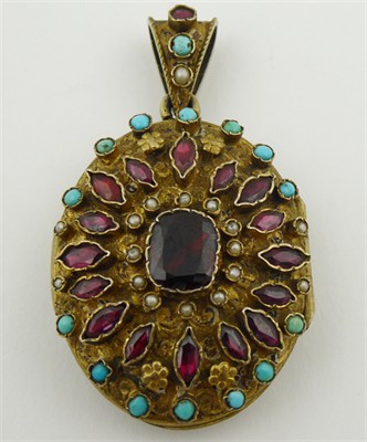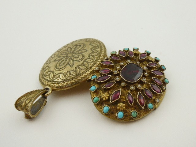 Zlacené stříbro, přírodní tyrkysy, přírodní almandiny a říční perličky. Větší oválný otevírací medailon ze zlaceného stříbra ze Sedmihradska (Transylvánie) sídla proslulého hraběte Draculy (Vlad III.). Uprostřed s velkým oblým přírodním ručně broušeným almandinem obklopeným říčními perličkami, dalšími menšími almandiny ručně broušenými do tvaru okvětních lístků a přírodními tyrkysy. Lícová i rubová strana medailonu dekorovaná gravírovanými ornamenty. Uvnitř medailonu prostor pro fotografii či jiný upomínkový malý předmět. Originální šperk, zajímavý i po sběratelské stránce. Značeno: rakousko-uherský vídeňský punc pro cizí zboží. Sedmihradsko (Transylvánie) 1868 - 1880. Výška medailonu včetně zdobného oka 55 mm, šířka medailonu 34 mm.