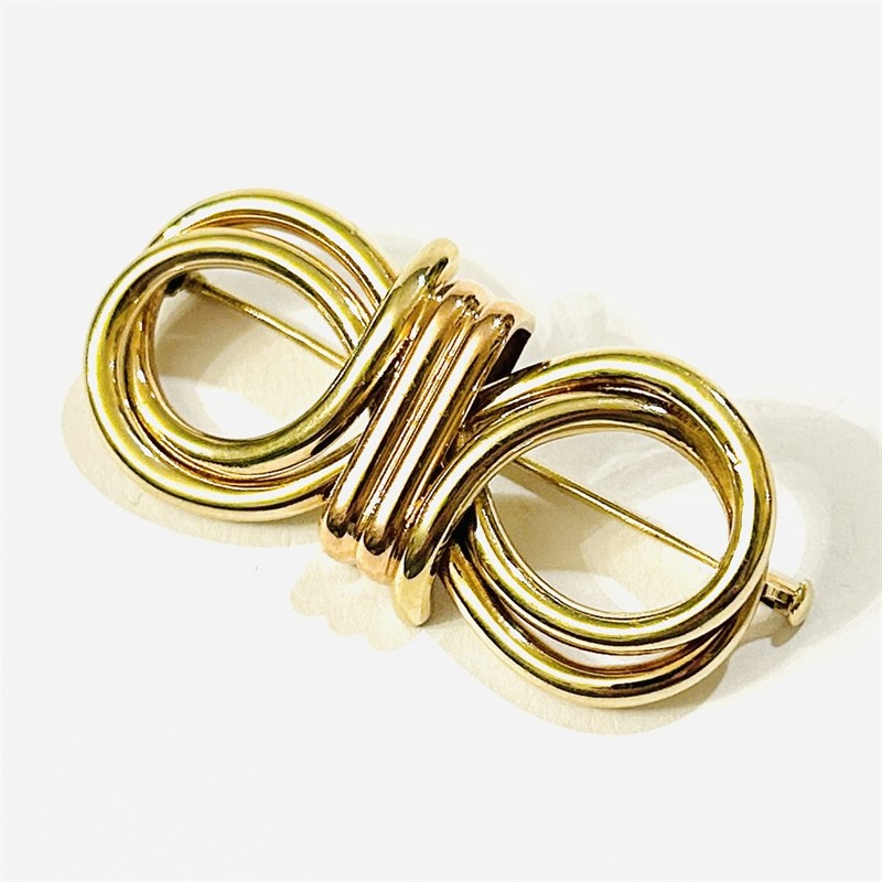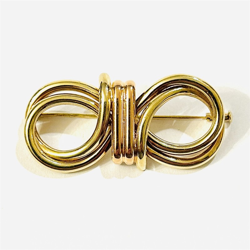 Elegantní brož z období art-deco ve tvaru stylizované, až futuristicky pojaté mašle, dynamické křivky pracující s kontrastním zbarvení kovu. Tuzemská klenotnická práce z 30. či 2. poloviny 40. let 20. století. Zhotoveno ze žlutého a červeného 14 karátového zlata, tj. o ryzosti 585/1000; prvorepublikový punc Z-45 (český lev 4), ryzostní číslo a mistrovská značka "VH" na jehle. Hmotnost 7,44 g, délka 45,5 mm, šířka 25,5 mm. Zapínání včetně trombónové pojistky v pořádku, ve velmi zachovalém stavu, odborně vyčištěno.