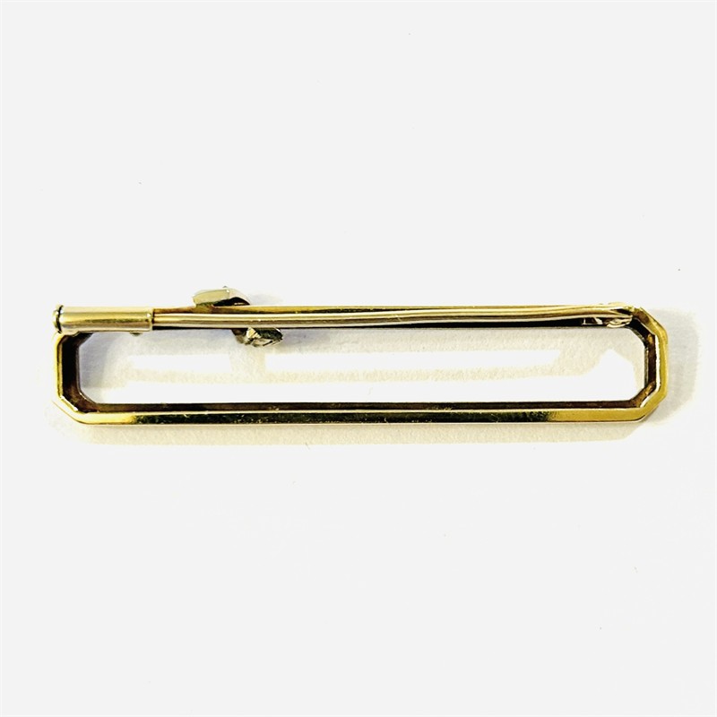 Elegantní, minimalistická brož z období art-deco. Geometricky pojaté fazetované tělo je zvýrazněno o vinutý pásek z bílého zlata, který je osazen 5 přírodními diamanty routového brusu. Opatřeno četnými průsvitkami. Nadčasový šperk, středoevropská klenotnická práce z 30. let 20. století. Zhotoveno ze žlutého bílého 14 karátového zlata, tj. o ryzosti 585/1000; nově opatřeno puncem Z-58 (labuť 4) z boku. Hmotnost 5,54 g, délka 51 mm, šířka 10 mm. Zapínání včetně trombonové pojistky v pořádku. Celkově ve velmi zachovalém stavu.