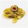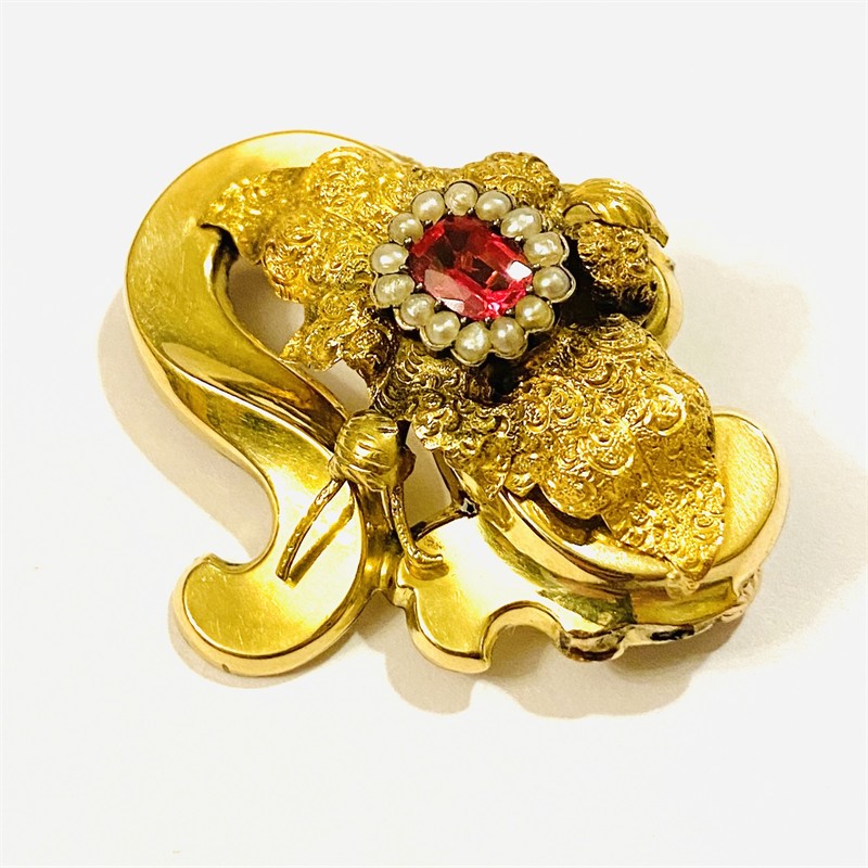č. 179 053 Zlatá biedermeierová brož s červeným kamenem a perlami