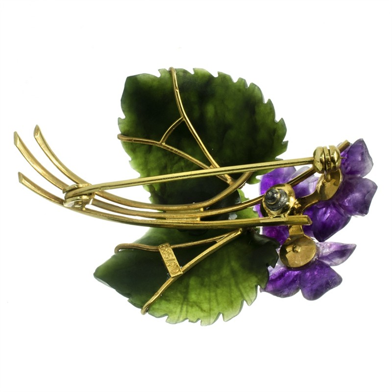 Brož ze žlutého zlata zdobená vyřezávanými drahými kameny (ametyst, nefrit a perličky) ve tvaru fialky. Au 585/1000, 9,30g. Čechy, 30. léta 20. století. Délka: 4,5 cm, šířka: 3cm.