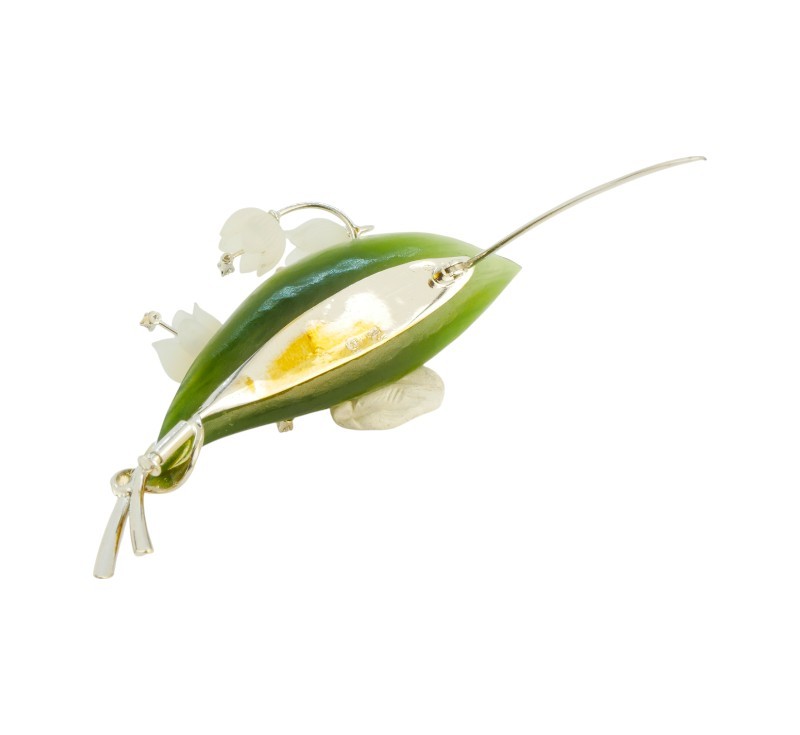 Zlatá brož ze zlata ryzosti 585/1000, lístky z nefritu, květy z bílého chalcedonu, drobounké briliantky. Rozměry 7,5 x 3 cm, celková hmotnost 15,11 g.