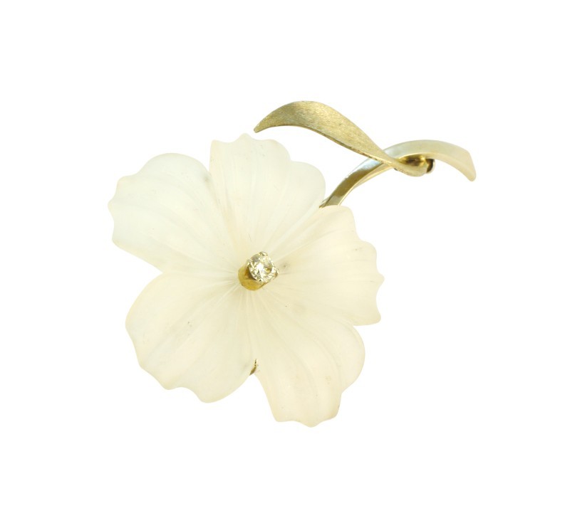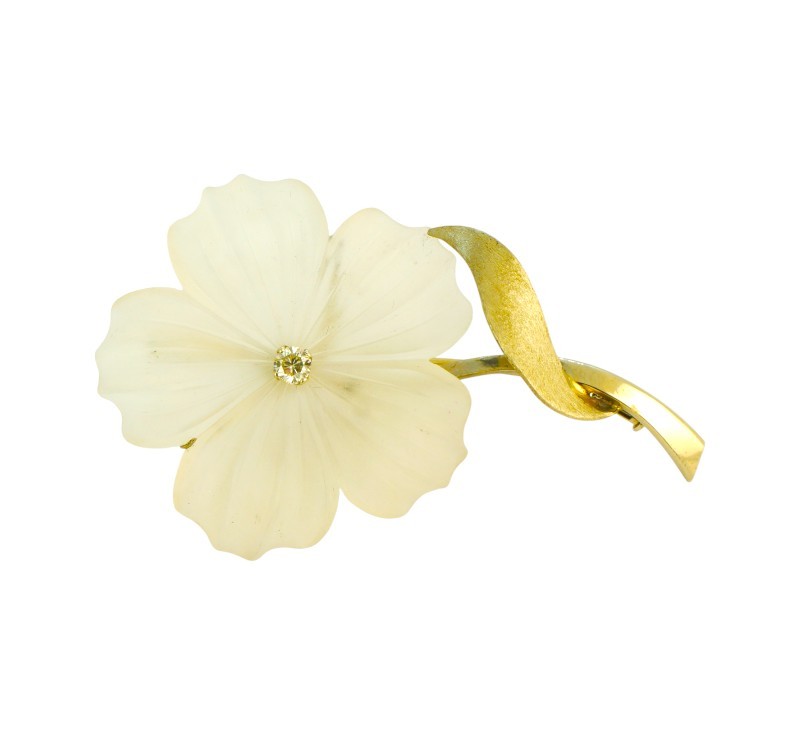 Brož ze bílého zlata ve tvaru květiny se středovým briliantem Okvětní plátky jsou vyřezány z horského křišťálu, střed květiny zdobí brilianty o hmotnosti 0,1 ct. Zlato ryzost 585/1000, hmotnost: 11,94 g. Rozměry: 4 x 6,3 cm.